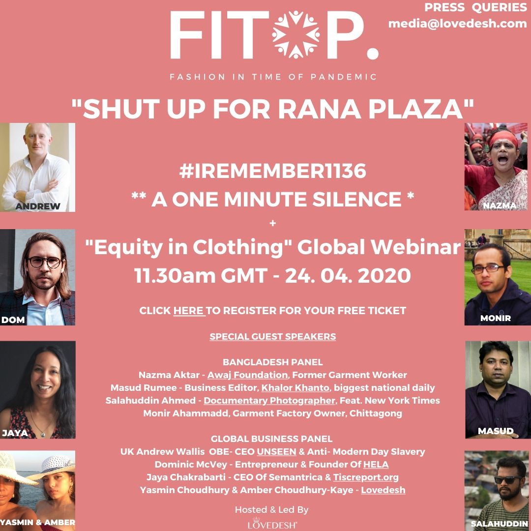 #IREMEMBER1136: SHUT UP FOR RANA PLAZA was unveiled at a low-profile Zoom panel session earlier in the day convened by Yasmin Choudhury of Lovedesh. Alongside her were: Ohidul, Rana Plaza survivor via audio call, Nazma Akter – Awaj Foundation, a former garment worker; Salahuddin Ahmed, Documentary Journalist; Masud Rumee, Business Editor, Kaler Kantho, Monir Ahammed, Owner, NCS Apparels; Jaya Chakrabarti, CEO of data organisation that produces tiscreport.org; Andrew Wallis, CEO & Founder of Unseen, an anti-modern day slavery organisation; Dominic McVey Entrepreneur & former Chairman of HELA, an apparel manufacturer worth $200 million.